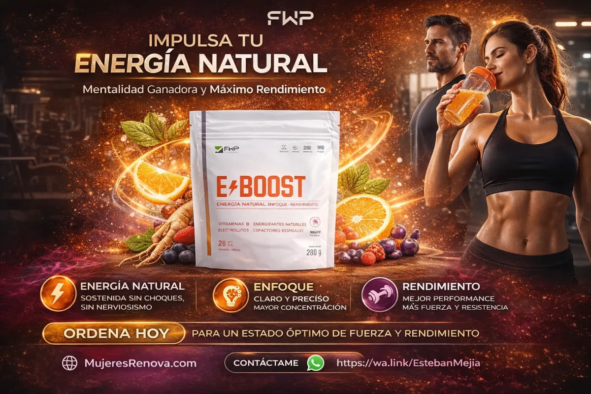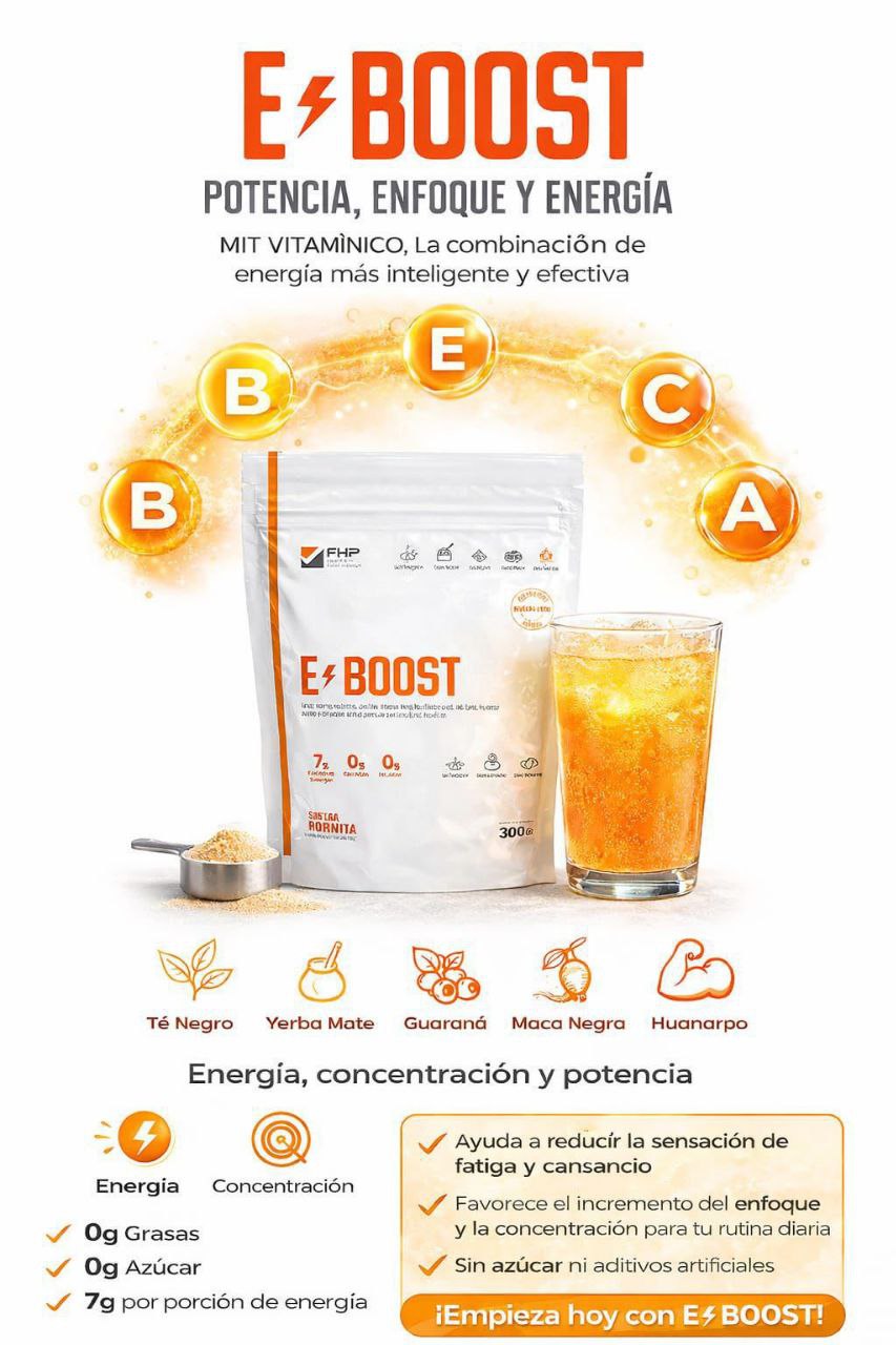 E-BOOST es una fórmula natural diseñada para ayudarte a sentir más energía, mejor enfoque y mayor rendimiento, sin químicos agresivos ni efectos secundarios.